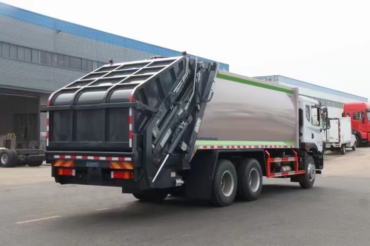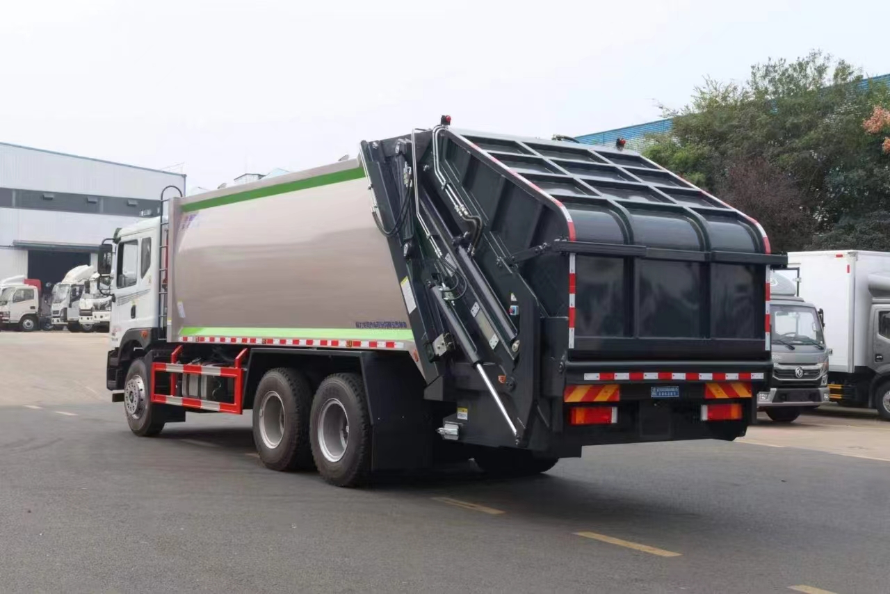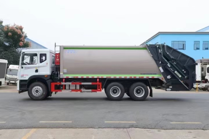 上裝配置 新款弧形箱體,箱體容積加大約22立方,箱體為優質高強度Q345錳鋼制作,底箱及填充器采用加厚鋼板,耐腐蝕使用壽命長,三層油漆噴涂處理/電泳工藝。裝載循環以及垃圾排出時間快,上裝部分具備雙向壓縮和蠕動壓縮功能帶。新款結構加大填充器,手電一體操作模式,帶駕駛室操作,帶駕駛室一鍵卸料功能,尾部裝置可以選裝垃圾翻轉斗,掛桶翻轉板或者大落地斗。PLC/CAN總線控制方式,光電開關加延時雙系統控制,降低故障率,方便維修。帶夜間照明裝置,帶污水箱,標配選用:定制油缸(質保兩年),中梅多路閥,液壓油泵(雙泵雙閥),帶液壓散熱器,嘉善取力器。